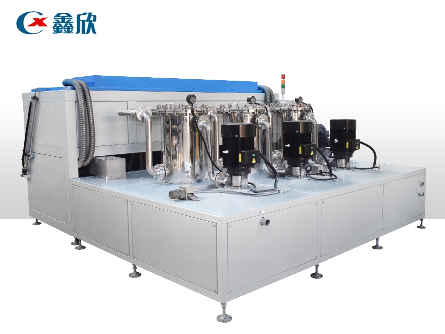 該設(shè)備有上下料網(wǎng)帶、超聲波清洗工位、噴淋漂洗工位、高壓風(fēng)切、熱風(fēng)烘干工位、溫控水加熱系統(tǒng)、風(fēng)機(jī)、溫控空氣加熱系統(tǒng)、移動式風(fēng)刀、PLC+觸摸屏控制系統(tǒng)、管路系統(tǒng)及智能電器控制系統(tǒng)等組成。自動進(jìn)排液和自動